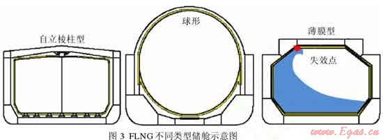 隨著 LNG 貨輪技術(shù)的不斷進(jìn)步,最近幾年提出的 FLNG 概念設(shè)計(jì)均采用鋼質(zhì)船體,配以不同形式的LNG 儲(chǔ)艙(圖2)。如 Shell 公司投資建造了一艘巨型 FLNG,采用雙殼式船身,SPB 型儲(chǔ)艙,長(zhǎng)488m,寬74m;空載質(zhì)量達(dá)26×104t,相當(dāng)于6艘航空母艦,滿載質(zhì)量達(dá)60×104t。該 FLNG 投資估計(jì)超過(guò)30×108美元,每年至少生產(chǎn)530×104t 液態(tài)產(chǎn)品,包括360×104t LNG、130×104t 凝析油和40×104t LPG。