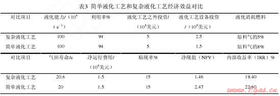 David Franklin等[4]對(duì) FLNG 采用簡(jiǎn)單液化工藝和復(fù)雜液化工藝的經(jīng)濟(jì)效益進(jìn)行比較,發(fā)現(xiàn)采用簡(jiǎn)單液化工藝效益更好(表3),液化能力同為100×104t·a-1的浮式天然氣液化裝置項(xiàng)目,采用簡(jiǎn)單液化工藝的凈現(xiàn)值是采用復(fù)雜液化工藝凈現(xiàn)值的1.69倍,內(nèi)部收益率高出3.2%??梢?jiàn),與陸上 LNG工廠不同,FLNG 對(duì)初始投資更敏感。簡(jiǎn)單液化工藝具有占用甲板面積小、設(shè)備少、檢修時(shí)間短、可在有限甲板空間上獲得較高產(chǎn)量等優(yōu)點(diǎn),更適用于 FLNG。