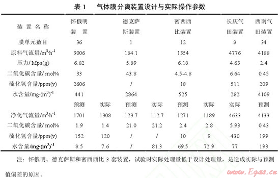 實(shí)際上從 20 世紀(jì) 80 年代以來,國內(nèi)外許多公司把膜分離技術(shù)應(yīng)用于天然氣凈化領(lǐng)域,做了大量的試驗(yàn)工作。表 1 是國內(nèi)外 5 套氣體膜分離裝置的設(shè)計(jì)與實(shí)際操作參數(shù),其中:懷俄明、德克薩斯和密西西比等 3 套裝置,采用美國格雷斯(GRECE)膜系統(tǒng)公司直徑為203.2mm的膜分離器[1];長慶氣田裝置,采用中科院大連化學(xué)物理研究所直徑為 200mm 的膜分離器,在原料氣處理量 12×104m3/d、壓力 5.4Mpa、溫度6~33℃條件下,經(jīng)膜系統(tǒng)凈化處理后,凈化氣壓力在 4.6Mpa時(shí)的水露點(diǎn)達(dá)到-13℃,甲烷回收率≥98%[2] ;西南油氣田裝置,由大連歐科膜技術(shù)工程有限公司負(fù)責(zé)成套,采用德國原裝進(jìn)口直徑為 150mm 的膜分離器[3],設(shè)計(jì)原料氣處理量10×104m3/d、壓力2.4Mpa、溫度 50℃條件下,天然氣脫水率>85% 、甲烷損失率 <1% 、水露點(diǎn):冬季<0℃ 、夏季<10℃ 。
