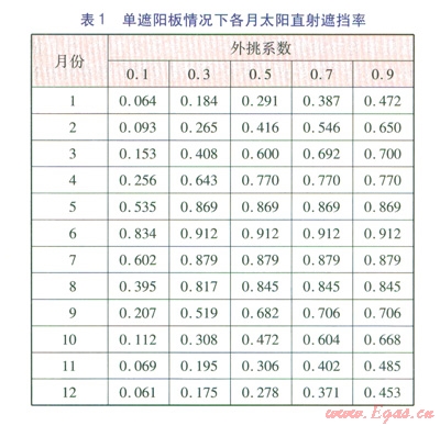 ①單純考慮太陽直射輻射時(shí),單遮陽板的外挑系數(shù)宜控制在0.3左右。