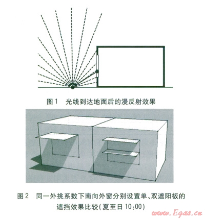 室內(nèi)的采光和視野。同一外挑系數(shù)下南向外窗分別設(shè)置單、雙遮陽板的遮擋效果比較(夏至日10:O0)見圖2。由圖2可知,設(shè)置雙遮陽板也能加強(qiáng)對(duì)直射光的遮擋。當(dāng)直射光從非正南入射時(shí),第二遮陽板能夠有效地削弱進(jìn)入室內(nèi)的太陽直射光,并且能將投射到下遮陽板的直射光以漫反射的形式投射到室內(nèi)深處,加強(qiáng)室內(nèi)深處的采光效果。