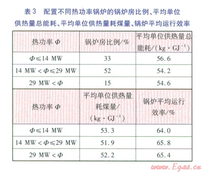 在對這27座鍋爐房進(jìn)一步的現(xiàn)場調(diào)查中發(fā)現(xiàn),配置不同熱功率鍋爐的鍋爐房能效指標(biāo)和鍋爐運(yùn)行效率不同。配置不同熱功率鍋爐的鍋爐房比例、平均單位供熱量總能耗、平均單位供熱量耗煤量、鍋爐平均運(yùn)行效率見表3。對于這27座鍋爐房,配置熱功率大于l4 MW且小于等于29 MW鍋爐的鍋爐房數(shù)量最多,鍋爐平均運(yùn)行效率也最高;配置熱功率大于29 MW鍋爐的鍋爐房數(shù)量最少,鍋爐平均運(yùn)行效率居中;配置熱功率小于等于14 MW鍋爐的鍋爐房數(shù)量居中且大多分布在中心城區(qū)以外,鍋爐平均運(yùn)行效率最低。