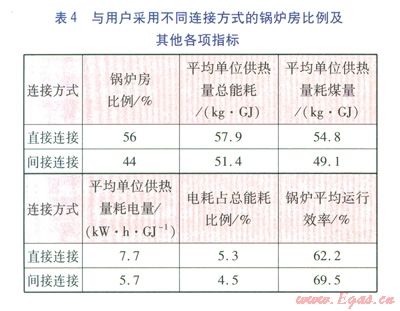 現(xiàn)場調(diào)查時發(fā)現(xiàn):當(dāng)鍋爐房與熱用戶采用直接連接方式時,平均單位供熱量耗電量較高,主要原因是動力設(shè)備耗電量較大。當(dāng)采用間接連接方式時,平均單位供熱量耗電量較低,主要原因是動力設(shè)備耗電量較少。與用戶采用不同連接方式的鍋爐房比例及其他各項(xiàng)指標(biāo)見表4。