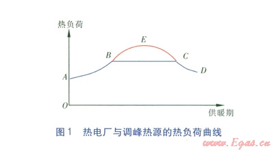 熱電廠與峰荷熱源的熱負(fù)荷曲線見圖l。由圖1可知,從供暖期開始至供暖期結(jié)束,基本熱負(fù)荷曲線為ABCD,當(dāng)進(jìn)入嚴(yán)寒期,峰荷熱源投入運(yùn)行,尖峰熱負(fù)荷曲線為BEC。采用圖l的熱負(fù)荷曲線運(yùn)行,熱電廠從供暖期開始至結(jié)束,承擔(dān)的熱負(fù)荷比較平穩(wěn)。若尖峰熱負(fù)荷由熱電機(jī)組承擔(dān),由此導(dǎo)致的多余電力消納將成為問題。