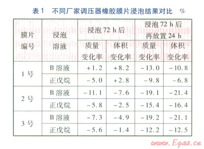 液態(tài)正戊烷對橡膠膜片的腐蝕性低于B溶液。為了驗證液態(tài)正戊烷和B溶液對橡膠膜片腐蝕程度的差異性,國家燃氣用具質(zhì)量監(jiān)督檢驗中心財3個不同調(diào)壓器廠家的橡膠膜片(分別編號為1號、2號和3號)按照標準中規(guī)定的試驗方法,分別采用液態(tài)正戊烷和B溶液進行浸泡,浸泡結(jié)果見表1。