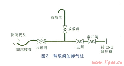 考慮到卸氣柱是高壓管道系統(tǒng),其主閥在使用過(guò)程中發(fā)生內(nèi)漏時(shí),就要及時(shí)更換。由于一般都是2套或3套卸氣柱通過(guò)高壓管道匯合在一起后連接到CNG減壓橇的進(jìn)口,如果某一卸氣柱的主閥需要更換時(shí),就要停止所有卸氣柱工作并放空高壓管道中的CNG。如果不允許CNG減壓橇停氣,就無(wú)法更換閥門。要解決這一問(wèn)題,可以在卸氣柱主閥后面增加一個(gè)常開(kāi)閥(此時(shí)主閥成雙閥結(jié)構(gòu))。帶雙閥的卸氣柱見(jiàn)圖3。
