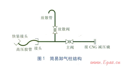 簡(jiǎn)易卸氣柱由連接CNG氣瓶車的快裝接頭、高壓膠管、主閥、放散閥、連接管道組成。簡(jiǎn)易卸氣柱結(jié)構(gòu)見(jiàn)圖l。