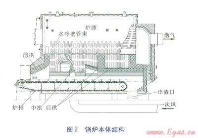 后拱的設(shè)計(jì)應(yīng)使火床的強(qiáng)烈燃燒區(qū)處于后拱的拱區(qū)內(nèi),并具有足夠的覆蓋率、容積高度,其長(zhǎng)度和高度比燃煤鍋爐有所增加,后拱出口應(yīng)有一個(gè)水平或向下的拱段。