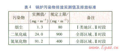 經(jīng)環(huán)保部門(mén)檢測(cè),鍋爐污染物排放實(shí)測(cè)值及規(guī)定上限見(jiàn)表4。執(zhí)行標(biāo)準(zhǔn)為GB l3271-2001《鍋爐大氣污染物排放標(biāo)準(zhǔn)》。由表4可知,各項(xiàng)污染物排放指標(biāo)符合要求。