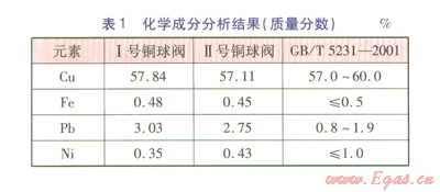 分別對Ⅰ號、Ⅱ號銅球閥閥體的化學(xué)成分進(jìn)行檢測分析,分析結(jié)果見表1。
