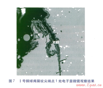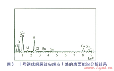 對Ⅱ號銅球閥裂口尖端處的灰色物質(zhì)試樣進(jìn)行掃描電子顯微鏡觀察,結(jié)果表明:裂紋表面可見明顯灰色覆蓋物。能譜分析結(jié)果表明主要成分為Cu、Zn、S、O和少量Cr、Mn等,Ⅱ號銅球閥裂紋尖端點(diǎn)l處的電子顯微鏡觀察結(jié)果和表面能譜分析結(jié)果見圖9、10。
