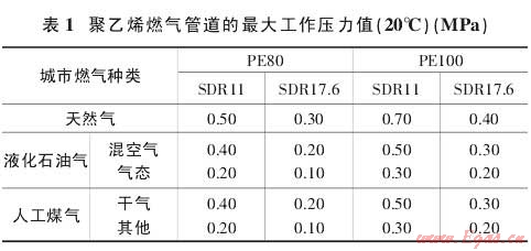1.2.2 在聚乙烯燃氣管道的壓力設(shè)計中,還需要考慮到燃氣中所包含的芳香烴類物質(zhì)所產(chǎn)生的影響,以及管道的施工條件等因素,根據(jù)國家相關(guān)的行業(yè)標(biāo)準(zhǔn),聚乙烯燃氣管道允許的最大工作壓力如表1。