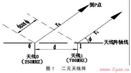 圖1為一個二元天線陣的示意圖,天線0同天線1均為偶極子天線,只是天線0為250MHz,天線1為700MHz。它們的取向(排列方向相同),兩天線間的距離為d,它們到觀察點p的距離分別為r0和r1,由于觀察點很遠,r0和r1可看成平行。在計算兩天線到p點的相位差時,可近似令r0≈r1,但計算兩天線到P點的相位時,應采用較為準確的關系式r1=r0-dcosφ,當兩天線電流大小和相位關系為I1=mI0e-ja時(m與a為常數(shù)),天線1的輻射波在到達p點時將較天線0的輻射波超前相位φ=kdcosφ-a,等式右邊第一項是由兩天線的相對位置引起的;第二項是由兩天線電流的相對相位引起的。φ是天線陣由天線0到天線1(由電流超前引向電流滯后)的軸線沿著逆時針方向旋轉到指向觀察點的射線夾角。如果天線0在p點產生的場強是E0,則由于電場強度正比于電流的一次方,故天線1在p點產生的場強應為E1=mE0ejφ,于是合成場強是E=E0+E1=E0(1+mjφ)可以看到,合成電場是由兩部分相乘求得的,第一個因子E0是天線0單獨產生于p點的場強,由天線0的類型(更確切的就是它的電流分布)決定;第二個因子(1+mejφ)只依兩天線之間電流比值和它們相互位置而定,與天線類型無關,這一因子稱為陣因子。因此,由相同兩天線構成的天線陣,它的合成方向圖是單獨一付天線的方向圖乘上因子。