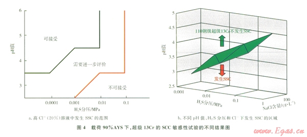 Cooling等人[10-11]通過按照NACE TM0177標準恒載荷、SSRT等方法,對超級13Cr在加載90%AYS條件下的SSC研究認為:當Cl-≤1 000 mg/L(氣井典型凝析水),pH值≥3.5、pH2S≤0.1 MPa時;或當65 200 mg/L<Cl-≤140000 mg/L(油氣井典型地層水),pH值為4.0~4.3、pH2S≤0.005 MPa時,超級13Cr不發(fā)生SSC,如圖4(a)所示。而Marchebois等人[12]結(jié)合工程實際,綜合考慮pH值、H2S分壓和Cl-含量,試驗得出超級13Cr的SSC敏感區(qū)域,其指導(dǎo)性更強,如圖4(b)所示。