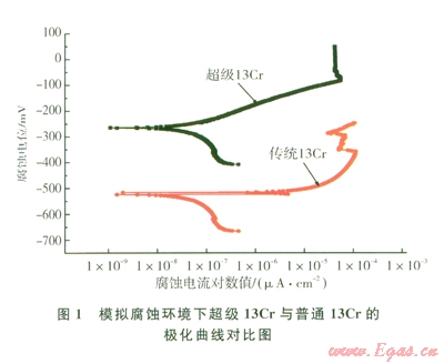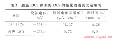 極化曲線測試結(jié)果如圖l、表3所示??梢钥闯?,超級l3Cr的腐蝕電位較傳統(tǒng)的L80-13Cr顯著正移,其腐蝕速率更是遠小于L80-13Cr的腐蝕速率,僅為0.01 mm/a。