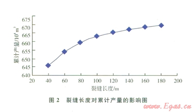圖2是不同裂縫半長生產(chǎn)1年的累計產(chǎn)量結(jié)果。可以看出,隨著裂縫長度增加,累計產(chǎn)量逐漸增大,隨著裂縫長度進一步增加,增幅變小。這是因為裂縫長短反映了儲層的供氣面積大小。當裂縫長度增加到一定程度后,縫長越大,氣體在裂縫中流動時的摩阻越高,反而會影響產(chǎn)量。在本算例中,最佳裂縫半長為60~80 m。