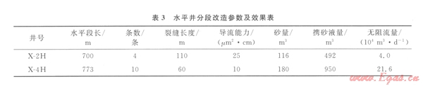 依據(jù)上述研究論證結(jié)果,確定了合理的壓裂水平井參數(shù),以保證投資最少、開發(fā)效果最優(yōu)為目的。使用優(yōu)化的壓裂水平井裂縫參數(shù)在該區(qū)塊應用了8口井,單井無阻流量7.2×104~27.6×104 m3/d.平均無阻流量為16.3×104 m3/d,與參數(shù)優(yōu)化前的無阻流量9.8×104 m3/d相比,增產(chǎn)效果顯著。