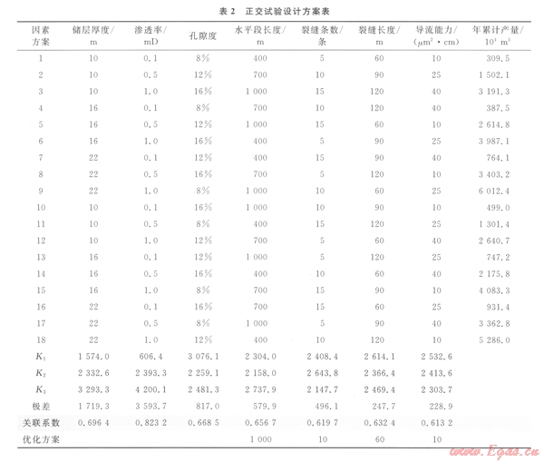 2)采用正交試驗分析理論對氣藏壓裂水平井產(chǎn)能參數(shù)的影響程度進行了分析,并運用灰色關聯(lián)分析方法進行了檢驗,找出了影響研究區(qū)塊壓裂水平井產(chǎn)能的主要參數(shù)排序依次為:地層滲透率、儲層厚度、孔隙度、水平段長度、裂縫條數(shù)、裂縫長度、導流能力。