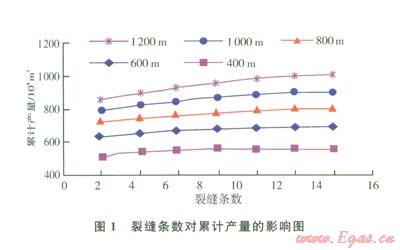 圖1是不同水平段長度、不同裂縫條數(shù)下生產(chǎn)l年的累計產(chǎn)量??梢钥闯觯S著裂縫條數(shù)增加,累計產(chǎn)量先增加最后趨于平穩(wěn)。因為隨著裂縫條數(shù)增加,裂縫間距變小,相互間干擾加重,導致每條裂縫產(chǎn)量減小造成的。考慮到裂縫條數(shù)增加,作業(yè)成本增大,因此存在一個最佳裂縫條數(shù)。當水平段長度為