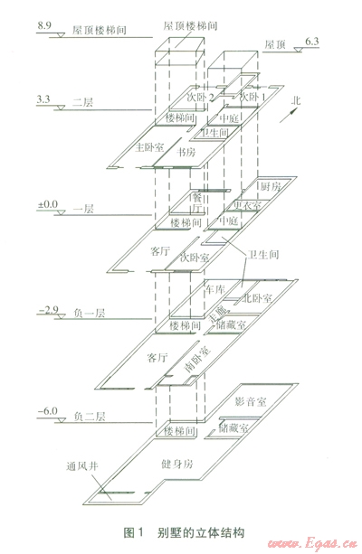該建筑物共有21個主要功能房間(包含衛(wèi)生間、車庫、儲藏室等),兩個豎向氣流通道(樓梯間、中庭)。樓梯間是貫通負二層至屋頂?shù)娜诵型ǖ?。中庭從一層通至屋頂,類似于舊式建筑的天井,是與室外相通的空間。別墅的立體結(jié)構(gòu)見圖1,圖中各層標(biāo)高的單位為m。