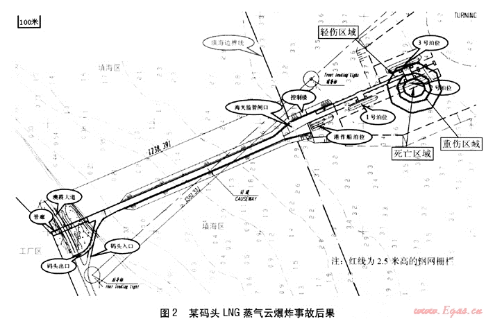 ② 從發(fā)生蒸氣云爆炸后果看,人員死亡、重傷半徑、輕傷半徑分別為40m、69m、117m;暴露在戶外的碼頭作業(yè)人員及船員將遭受重傷以上的傷害,停泊在碼頭的船舶及LNG管道、裝卸臂等設(shè)備設(shè)施將遭受?chē)?yán)重破壞。