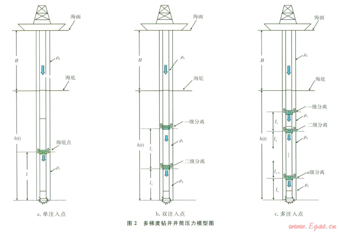 隨著陸上和淺海油氣資源的持續(xù)不斷開(kāi)發(fā),勘探開(kāi)發(fā)轉(zhuǎn)向海洋尤其轉(zhuǎn)向深水已成為必然。但與陸地和淺海鉆井相比,深水海域特殊的自然環(huán)境和復(fù)雜的油氣儲(chǔ)藏條件產(chǎn)生了常規(guī)鉆井裝備和工藝難以克服的技術(shù)難題[1]:采用錨泊定位鉆機(jī)本身必須承受笨重的錨泊系統(tǒng)的重量,給鉆機(jī)定位增加了難度;隔水管除了承受自身重量,還需要承受諸如海流及惡劣的海洋環(huán)境載荷;在海底泥線處的高壓和低溫環(huán)境對(duì)鉆井液性能影響;海底的不穩(wěn)定性、淺層水流動(dòng)、天然氣水合物控制對(duì)鉆井的風(fēng)險(xiǎn);對(duì)于常規(guī)鉆井工藝,尤其難于控制井筒鉆井液循環(huán)當(dāng)量密度在允許的作業(yè)壓力窗口之間。針對(duì)井筒壓力控制難度較大的問(wèn)題,國(guó)外20世紀(jì)90年代提出和發(fā)展的雙梯度鉆井技術(shù)[2]。目前已實(shí)施5個(gè)聯(lián)合工業(yè)項(xiàng)目,并取得了階段性成果[3],提出了多套技術(shù)方案,包括海底泵舉升鉆井液、隔水管氣舉、隔水管稀釋以及注空心玻璃球(Hollow Glass Spheres,簡(jiǎn)稱空心球)等,以實(shí)現(xiàn)井筒壓力的優(yōu)化控制。本文基于雙梯度鉆井技術(shù),提出了多梯度鉆井技術(shù),該技術(shù)比雙梯度鉆井能更好地匹配地層壓力,使井底壓力在較長(zhǎng)的距離內(nèi)介于地層壓力和破裂壓力之間,能夠簡(jiǎn)化深水復(fù)雜井身結(jié)構(gòu),有效控制井筒環(huán)空壓力,實(shí)現(xiàn)安全鉆進(jìn),同時(shí)提高鉆進(jìn)效率。