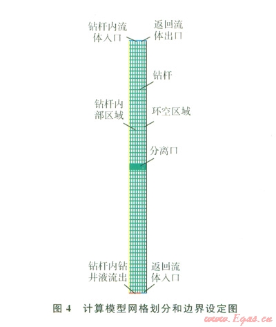 井下多相流分離的順利實(shí)施是多梯度鉆井技術(shù)實(shí)現(xiàn)的關(guān)鍵。采用FLUENT混合物(Mixture)模型[7-8]建立空心球注入模型,網(wǎng)格劃分及邊界條件如圖4所示。假設(shè)混合了空心球的鉆井液是不可壓縮流體,由于正常鉆進(jìn)時(shí)鉆井液的流量基本恒定,可假定鉆井液的流動(dòng)是定常流動(dòng)。在直角坐標(biāo)中混合流體的運(yùn)動(dòng)控制方程[9]: