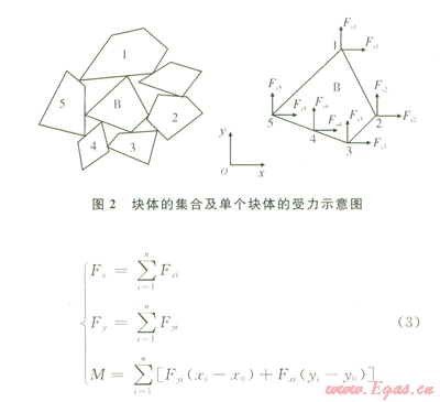 式中Fx、Fy分別為x、y方向上的合力;M為合力矩。其中(x0,y0)為塊體B質(zhì)心坐標(biāo),力矩以逆時(shí)針?lè)较驗(yàn)檎?。?duì)公式(3)求導(dǎo)可以得出塊體質(zhì)心的運(yùn)動(dòng)方程,對(duì)質(zhì)心的運(yùn)動(dòng)方程進(jìn)行向前差分格式數(shù)值積分可以得到巖塊質(zhì)心沿x或y方向的速度和位移。