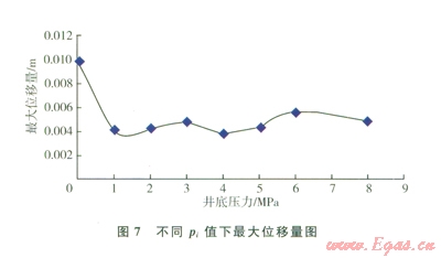 由位移矢量圖可見(jiàn),井底壓力在0 MP。時(shí)位移變化最大,隨后開(kāi)始減小,到5 MPa后又明顯增大,取出各pi值時(shí)最大位移量進(jìn)行比較有如圖7關(guān)系。