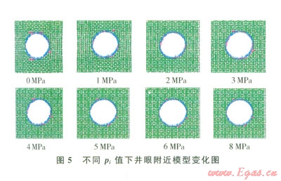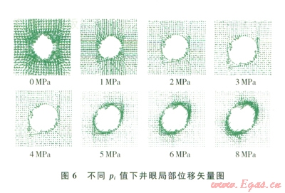 通過(guò)改變井眼有效壓力值pi (pi=0 MPa、1 MPa、2 MPa、3 MPa、4 MPa、5 MPa、6 MPa、8 MPa),得出相應(yīng)壓力值下形成井眼后模型的各種宏觀、微觀變化。