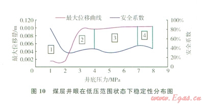 從圖上可見(jiàn),在0~l MPa兩種狀態(tài)中,塊體安全系數(shù)均小于20%,而塊體的安全系數(shù)在2~8 MPa幾種狀態(tài)下都超過(guò)78%,所以在這些壓力狀態(tài)下井壁更加穩(wěn)定。將最大位移與安全系數(shù)分布進(jìn)行耦合,得出煤層在低壓范圍內(nèi)最佳穩(wěn)定區(qū)間(圖10)。