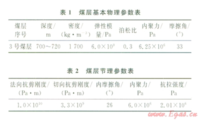 筆者選擇的研究對(duì)象為3號(hào)煤層,煤層的各種力學(xué)參數(shù)設(shè)置參照眾多研究成果,見(jiàn)表l、2。