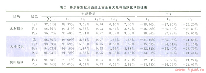 研究區(qū)氣藏除了來(lái)自本區(qū)山西組-羊虎溝組太原組煤系烴源巖的自生自儲(chǔ)型氣源外,也有可能接受東側(cè)天環(huán)向斜早期的側(cè)向供烴。天環(huán)向斜北部二疊系下部(山西組、太原組)和石炭系羊虎溝組有效烴源巖的目前的成熟度為I.35%~2.0%,區(qū)域資料證實(shí)其在西緣構(gòu)造定型之前與西緣的源巖演化較為一致,西緣構(gòu)造隆升除了可以接受本區(qū)下部烴源巖的垂向供烴外,也可以接受天環(huán)向斜的側(cè)向供烴。另外,研究區(qū)天然氣組分特征及輕烴同位素特征與天環(huán)北段有一定的相似性(表2),表明其有可能是同源的天然氣,因而不能排除天環(huán)向斜為其來(lái)源之一。