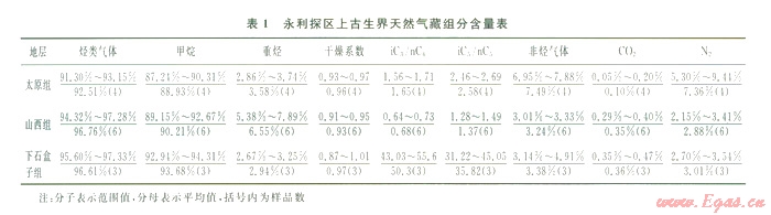 1)永利探區(qū)上古生界氣藏天然氣組分以烴類氣體為主,甲烷為烴類氣體的主要組分,其含量多超過(guò)90%,非烴氣體以氮?dú)鉃橹?,極少量為二氧化碳;氣藏的重?zé)N含量不高,干燥系數(shù)較高,氣藏總體上偏干,下石盒子組天然氣曾經(jīng)經(jīng)歷過(guò)較明顯的分餾作用。