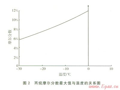 根據(jù)“壓縮天然氣汽車燃料推薦做法”(SAEJ1616-1994)的規(guī)定,新版ISO 15403-1-2006推薦在可能達(dá)到的最低環(huán)境溫度和最高操作(或儲存)壓力下,CNG中冷凝液態(tài)烴的總量應(yīng)不超過1%(摩爾分?jǐn)?shù))。壓力在6 000~10 000 kPa范圍內(nèi)要求冷凝液態(tài)烴總量不超過l%時,不同溫度下CNG中相應(yīng)的最大丙烷和丁烷含量分別如圖2、3所示。