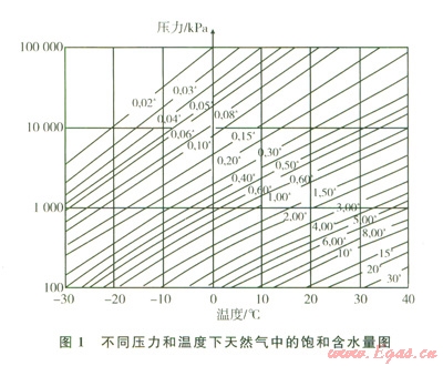 同時,在新版ISO/TR l5403-2-2006的附錄E中列出了如圖l所示的不同壓力和溫度下天然氣中的飽和含水量,此圖是根據(jù)“天然氣水含量與水露點(diǎn)之間的關(guān)聯(lián)”(GB/T 22634-2008、ISO 18453-2004)制作的。圖1表明:天然氣中含水量小于30 mg/m3時,在25 MPa高壓下,其水露點(diǎn)低于-l3℃。這對于中國大部分地區(qū)均適用。