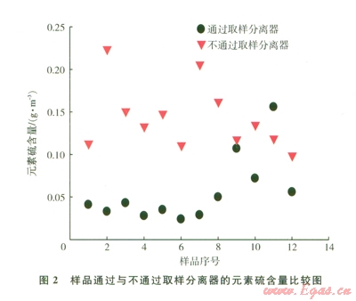同時,為避免水和顆粒物等對井口取樣準確性的影響,常規(guī)天然氣分析常會采用取樣分離器。但從試驗研究結果來看,樣品通過取樣分離器取樣測定的元素硫含量低于樣品不通過取樣分離器取樣測定的元素硫含量(圖2)。岡此,元素硫取樣方案中應明確提出采用樣品不通過取樣分離器方式進行取樣,這是準確測定元素硫含量的關鍵環(huán)節(jié)。