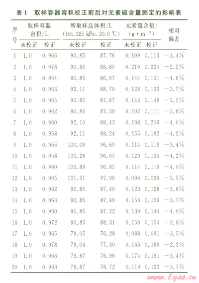 為了保證取樣時取樣容器中不含影響測定準確性的水和氧氣等干擾物,在取樣前對容器進行干燥和無氧化處理是非常重要的。同時由于計算元素硫含量時,需要掌握樣品在標準參比條件(我國為101.325kPa,20.0℃)下的體積。而天然氣樣品是采集在壓力下的取樣容器中的,當已知取樣容器的容積、樣品的壓力和氣體在壓力下的壓縮岡子,根據(jù)氣體狀態(tài)方程,可計算天然氣樣品在標準參比條件下的體積。因此,如何準確測定取樣容器的容積是實施測定前必須考慮的關鍵因素之一。表l為取樣容器進行容積校正前后對元素硫測定結果的影響程度??梢钥闯?,取樣容器未校正元素硫含量值比校正元素硫含量值低2%~5%。