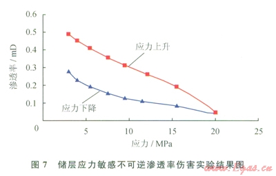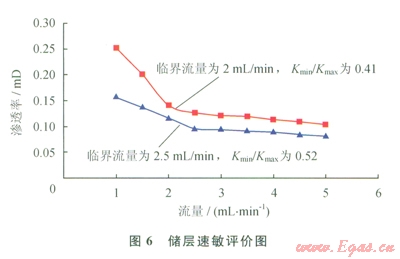 2)中等速敏和壓力敏感損害:儲層巖心液測速敏實驗表明,在1~5mL/min的測定流量范圍內(nèi),巖心的最小滲透率Kmin和最大滲透率Kmax分別為0.1029mD、0.2514mD和0.08mD、0.155mD,臨界流量為2~2.5mL/min,Kmin/Kmax分別為0.41、0.52,液測速敏損害較強(qiáng)(圖6)。儲層巖心應(yīng)力敏感實驗結(jié)果由實驗結(jié)果可知:該地區(qū)低滲透儲層的應(yīng)力敏感性為中等損害,滲透率由0.49mD降低為應(yīng)力變化后的0.275mD,其應(yīng)力敏感引起的不可逆滲透率損害率為43.9%(圖7)。