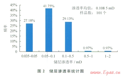 根據(jù)砂巖儲層孔隙度、滲透率與最大孔喉半徑的關(guān)系,該區(qū)塊儲層滲透率主要分布在0.035~0.5mD,占98.06%,主要孔喉半徑分布在O.1~0.8mm;儲層最大滲透率范圍在0.5~2mD,其對應(yīng)的最大孔喉半徑范圍0.8~3.0mm,該儲層對滲透率貢獻(xiàn)率最大的孔喉半徑區(qū)間為0.1~0.8mm和0.8~3.0mm。