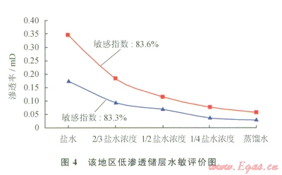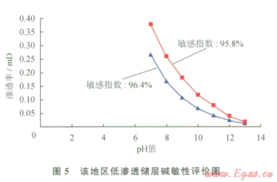 1)儲層巖心具有較強(qiáng)的水鎖、水敏和堿敏損害特征:根據(jù)對該地區(qū)低滲透儲層段含水飽和度的統(tǒng)計,其儲層段含水飽和度平均為64.81%,對照實驗結(jié)果,儲層段受到中等偏強(qiáng)水鎖損害(表1)。儲層段巖心水敏性實驗表明,滲透率分別由0.3485mD降至0.0572mD、由0.1750mD降至0.0292mD,巖心的敏感指數(shù)分別為83.6%和83.3%,說明該地區(qū)低滲透儲層段具有強(qiáng)水敏性(圖4)。儲層段巖心堿敏評價實驗結(jié)果表明,當(dāng)pH值由7升至l3時,巖心滲透率分別南0.3762mD降至0.0158mD、由0.2639mD降至0.0095mD,巖心的堿敏感指數(shù)分別為95.8%和96.4%,該地區(qū)低滲透儲層具有強(qiáng)的堿敏性(圖5)。