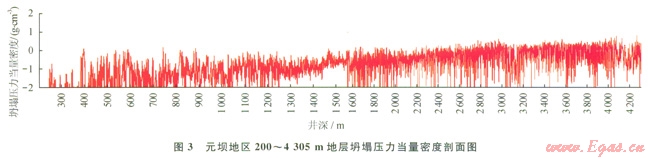 根據(jù)井壁穩(wěn)定性分析結(jié)果,深度小于2800m的地層當(dāng)量應(yīng)力低于地層巖石的綜合強(qiáng)度,氣體鉆井井壁穩(wěn)定性較好如圖2,而深度超過2800m的地層坍塌密度高于空氣鉆井臨界坍塌壓力當(dāng)量密度值(圖3),這些層段‘營氣鉆井過程中存在垮塌掉塊,可通過優(yōu)化鉆井參數(shù)來克服,并做好氣液轉(zhuǎn)換準(zhǔn)備;千佛崖組—須家河組地層氣體鉆井穩(wěn)定性較差,YB3井在自流井組3727.8~3791.5m應(yīng)用氮?dú)忏@井,僅進(jìn)尺63.7m,不但后期通井循環(huán)時間較長,鉆井費(fèi)用也有所增加,在目前技術(shù)條件下該井段采用氣體鉆井還存在一定難度。