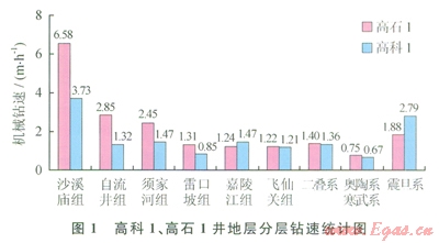 海相地層占全井進(jìn)尺的57%(約3000m),巖石強(qiáng)度高,硅質(zhì)含量重,部分層段含燧石結(jié)核和角礫云巖,機(jī)械鉆速極低,高科1井、高石l井各地層平均機(jī)械鉆速統(tǒng)計如圖1所示,不能采用氣體鉆提速的陸相碎屑巖地層的平均機(jī)械鉆速小于2.50m/h,嚴(yán)重影響了全井鉆井速度。