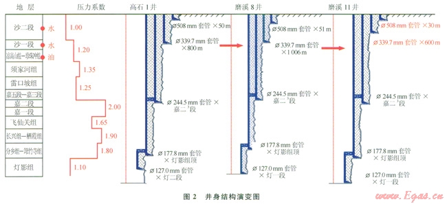 通過對高石梯 磨溪構(gòu)造已鉆井井身結(jié)構(gòu)進(jìn)行分析,已鉆大多數(shù)井在大尺寸Æ444.50mm井眼段可超過1000m,見圖2中的高石l井,常規(guī)鉆井液鉆進(jìn)速度慢,耗時長;為開展氣體鉆井提速試驗,第一輪磨溪8井等將Æ339.7mm套管下深l006m(圖2),但高石2井、磨溪8井在實施氣體鉆井過程中因為地層出水、出油,難以發(fā)揮氣體鉆井提速優(yōu)勢,井身結(jié)構(gòu)不能滿足鉆井提速的需要(圖1、2)。