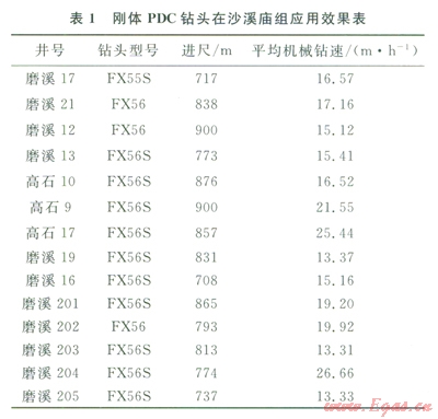 通過試驗與優(yōu)化改進(jìn)PDC鉆頭,逐步優(yōu)選出適應(yīng)各層位的PDC鉆頭型號(圖6),機(jī)械鉆速和單只鉆頭進(jìn)尺大幅度提高,第二批正鉆井在沙溪廟地層試驗剛體PDC鉆頭取得新進(jìn)展,平均機(jī)械鉆速由傳統(tǒng)胎體PDC鉆頭7.24m/h提高到16.27m/h(表1),已接近空氣鉆進(jìn)效果。
