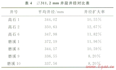 有機(jī)鹽鉆井液體系在高石2井、高石6井、磨溪8井、磨溪9井、磨溪l0井的Æ311.2mm井段和Æ215.9mm井段現(xiàn)場應(yīng)用。表4為高石2、高石6、磨溪8、磨溪9、磨溪l0井Æ311.2mm井段應(yīng)用有機(jī)鹽鉆井液的平均井徑對比數(shù)據(jù),轉(zhuǎn)換為有機(jī)鹽體系后的滾動回收率均提高,機(jī)械鉆速明顯提高,平均井徑擴(kuò)大率明顯降低(表4),高石2井等井由于上部氣體鉆形成的大井徑,造成井徑擴(kuò)大率偏高。