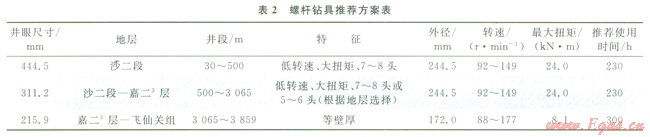 鉆井提速技術(shù)已經(jīng)廣泛應(yīng)用PDC鉆頭+螺桿鉆具的復(fù)合鉆井模式[2],螺桿的使用增加了井底鉆頭轉(zhuǎn)速從而大幅提高鉆井速度。但常規(guī)螺桿鉆具在大尺寸井段的扭矩不足,隨著井底溫度升高也會對螺桿定子橡膠產(chǎn)生影響[5-6],通過對不同井眼尺寸的螺桿鉆具應(yīng)用試驗效果進(jìn)行分析,推薦了螺桿鉆具應(yīng)用的參數(shù)要求(表2),從而更好地與PDC鉆頭使用時間匹配:
