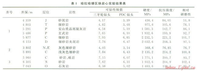 塔北地區(qū)地層自上而下主要為新生界第四系、新近系、古近系,中生界白堊系、侏羅系、三疊系,古生界二疊系、石炭系、泥盆系、志留系、奧陶系,部分區(qū)塊存在層位缺失。實(shí)鉆資料顯示古生界機(jī)械鉆速慢,為提速瓶頸地層。因此以該地區(qū)哈拉哈塘區(qū)塊為例,進(jìn)行了一定數(shù)量的此井段巖心室內(nèi)測(cè)試,測(cè)試結(jié)果如表1所示。根據(jù)實(shí)鉆資料和巖心室內(nèi)試驗(yàn)結(jié)果,總結(jié)塔北地區(qū)鉆井提速難點(diǎn)如下。