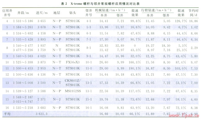 X-treme螺桿(Æ203mm)+PDC鉆頭復(fù)合鉆井技術(shù)在塔北地區(qū)哈拉哈塘、新墾、熱普區(qū)塊13口井第二次開(kāi)鉆的Æ241.3mm井眼上部井段進(jìn)行了應(yīng)用,應(yīng)用地層為新近系—三疊系、部分井進(jìn)入二疊系頂部,平均單井進(jìn)尺3631.3m,平均機(jī)械鉆速和行程鉆速分別為l6.66m/h和11.89m/h,表2為X-treme螺桿(Æ203mm)與鄰井常規(guī)螺桿應(yīng)用情況對(duì)比。