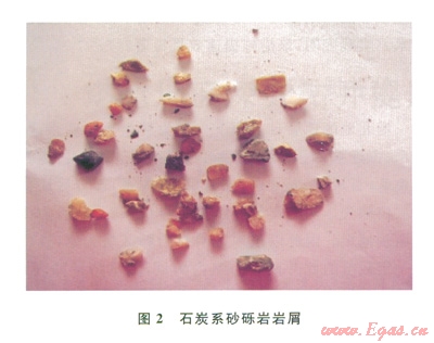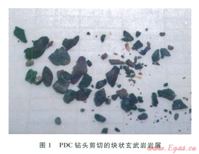 2)二疊系:巖性復(fù)雜,主要為玄武巖、砂巖和泥巖互層。地層硬度大,達(dá)l581.26MPa,可鉆性差,三牙輪可鉆性級(jí)值達(dá)7.65,PDC鉆頭可鉆性級(jí)值達(dá)6.1;玄武巖致密、性脆、硬度極高,耐磨性強(qiáng),對(duì)鉆頭傷害極大,導(dǎo)致跳鉆現(xiàn)象,崩壞PDC鉆頭切削齒;PDC鉆頭失效造成多余的起下鉆,而換成牙輪鉆頭后機(jī)械鉆速極低,多分布于1~2m/h,低至1m/h,導(dǎo)致鉆井周期增大,為該地區(qū)鉆井難度最大的地層。圖l為塊狀玄武巖屑照片。